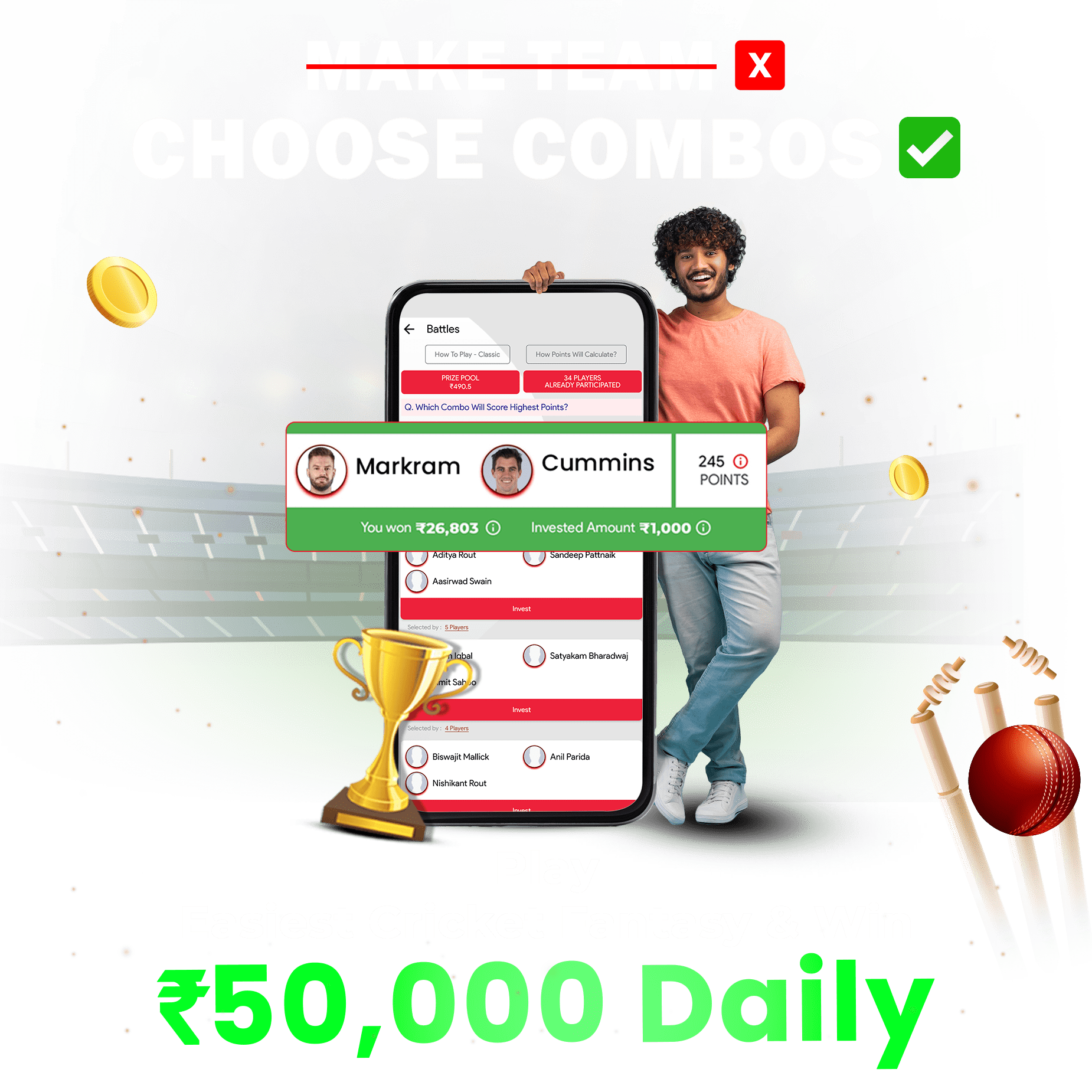 ClashX allows you to go head-to-head by creating your own combo of 4 players - a bowler, batsman, wicket-keeper, and all-rounder. Based on the performance of these chosen players in actual matches, participants earn points. The goal is to strategize and build a combo that outperforms other participant. In-depth cricket knowledge and thorough player stats analysis serve as a valuable assets.